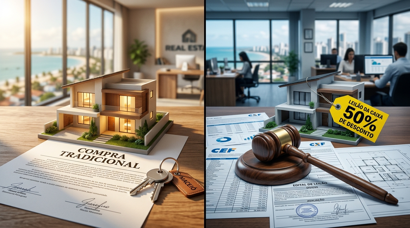 O mercado imobiliário em Alagoas atingiu um nível de maturidade e diversificação fascinante em 2026. Para quem está com o capital em mãos ou com o crédito pré-aprovado, o cardápio de opções em Maceió e na Região Metropolitana nunca foi tão vasto. No entanto, diante de tanta oferta, uma encruzilhada se apresenta para 9 entre 10 clientes que chegam ao escritório: devo comprar um imóvel no mercado tradicional, escolhendo a dedo e pegando as chaves imediatamente, ou devo me aventurar no mercado de leilões da Caixa Econômica Federal em busca de descontos que podem chegar a 70%?